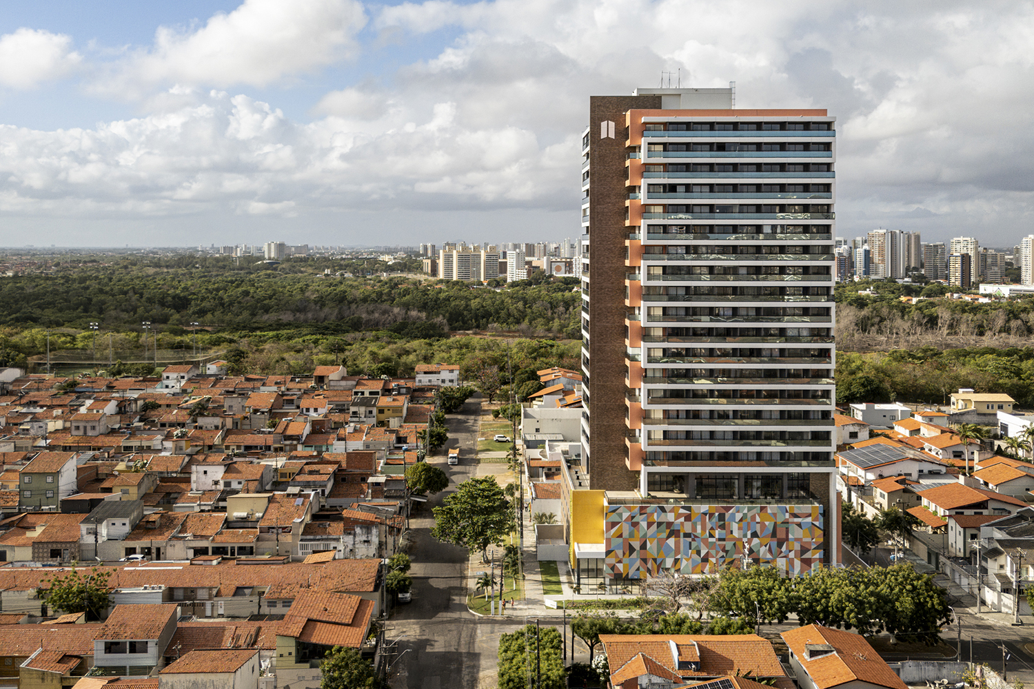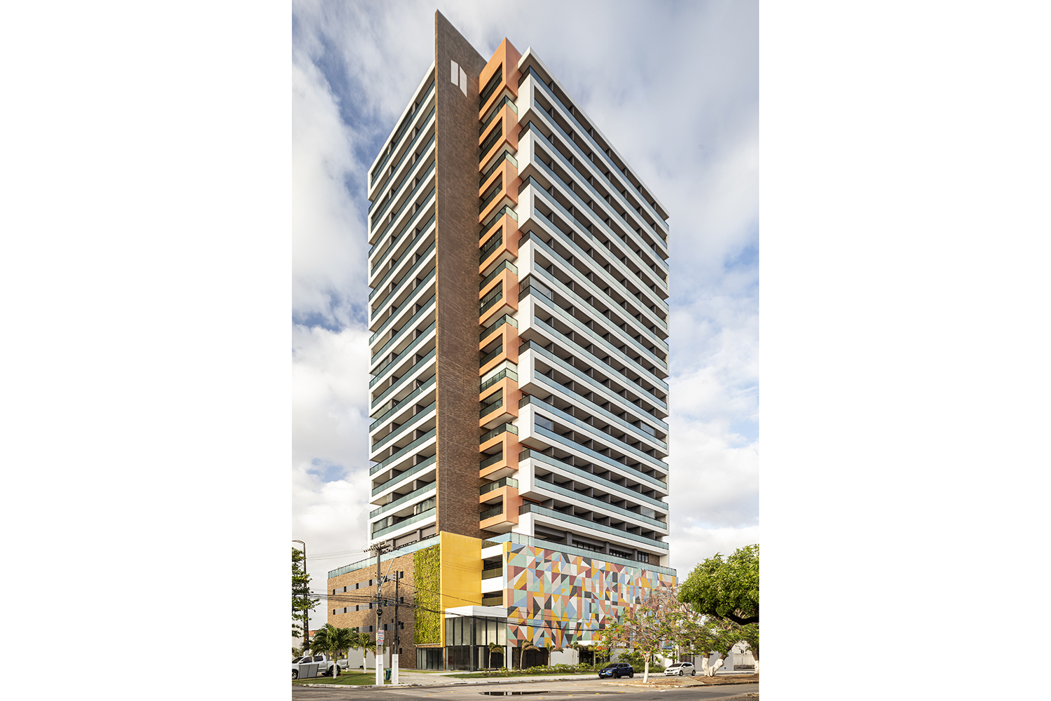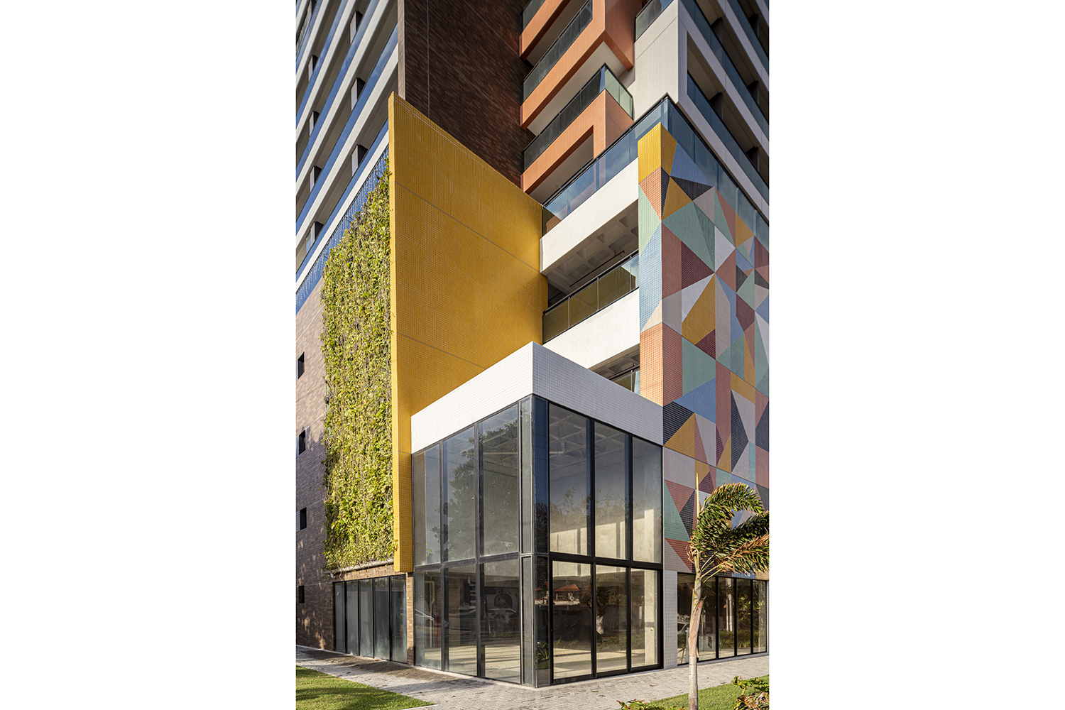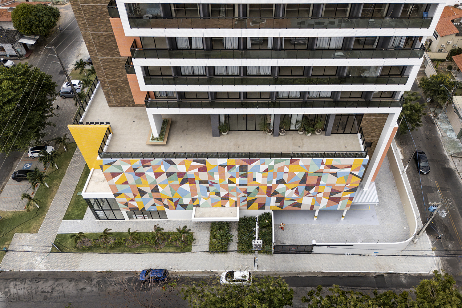 Projeto para edifício de apartamentos compactos de alto padrão. Destaca-se a fachada com cores marcantes e o grande painel artístico multicolorido.