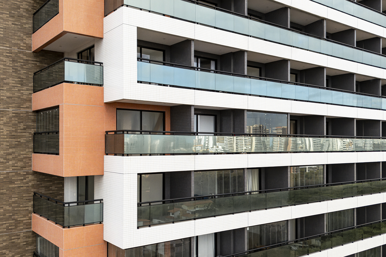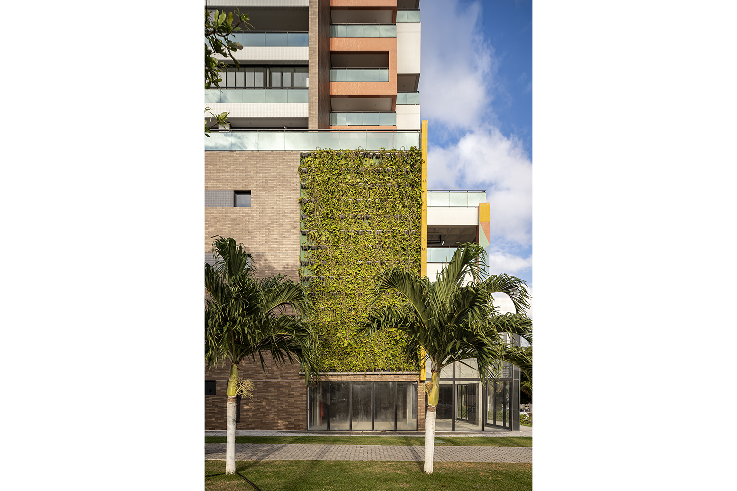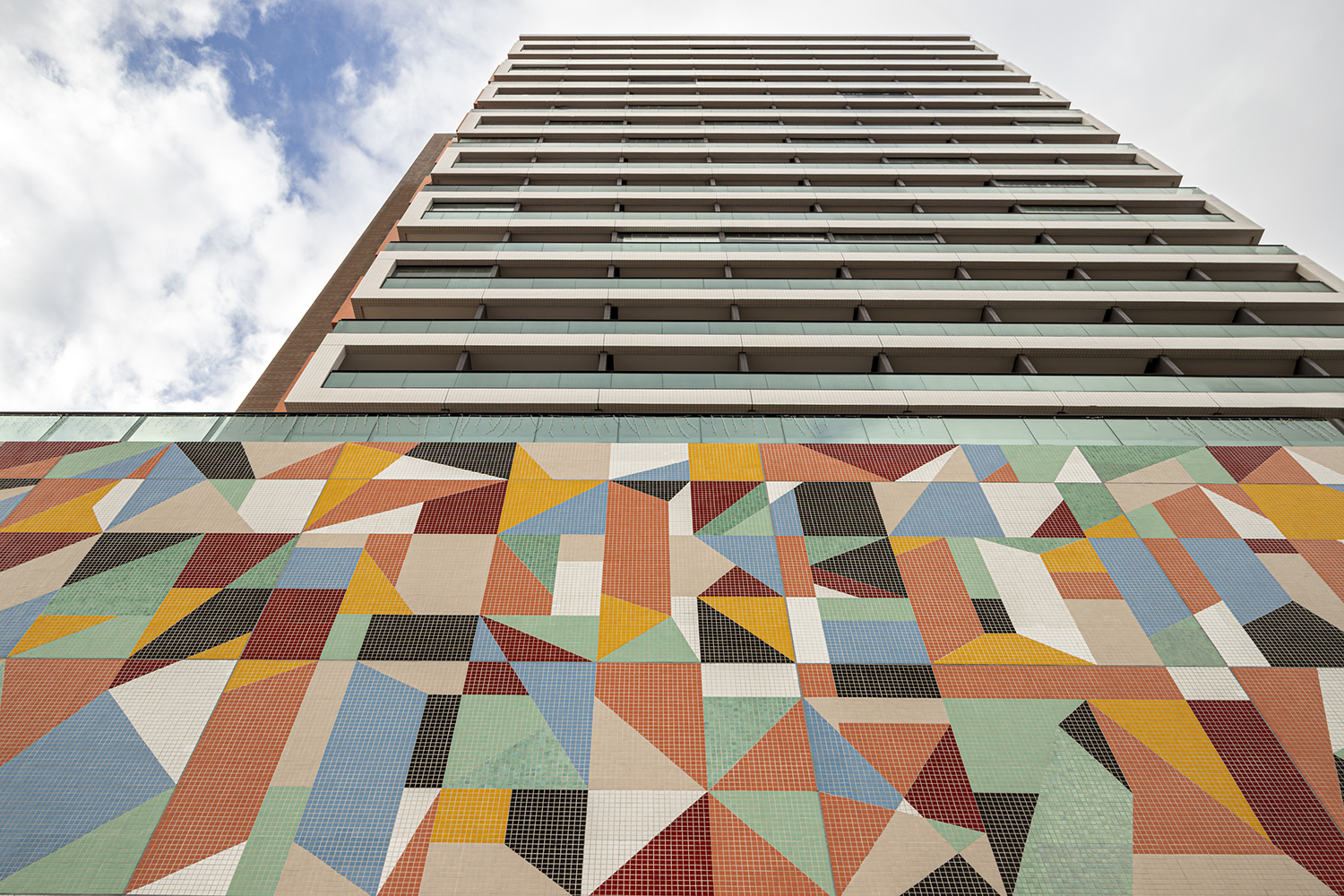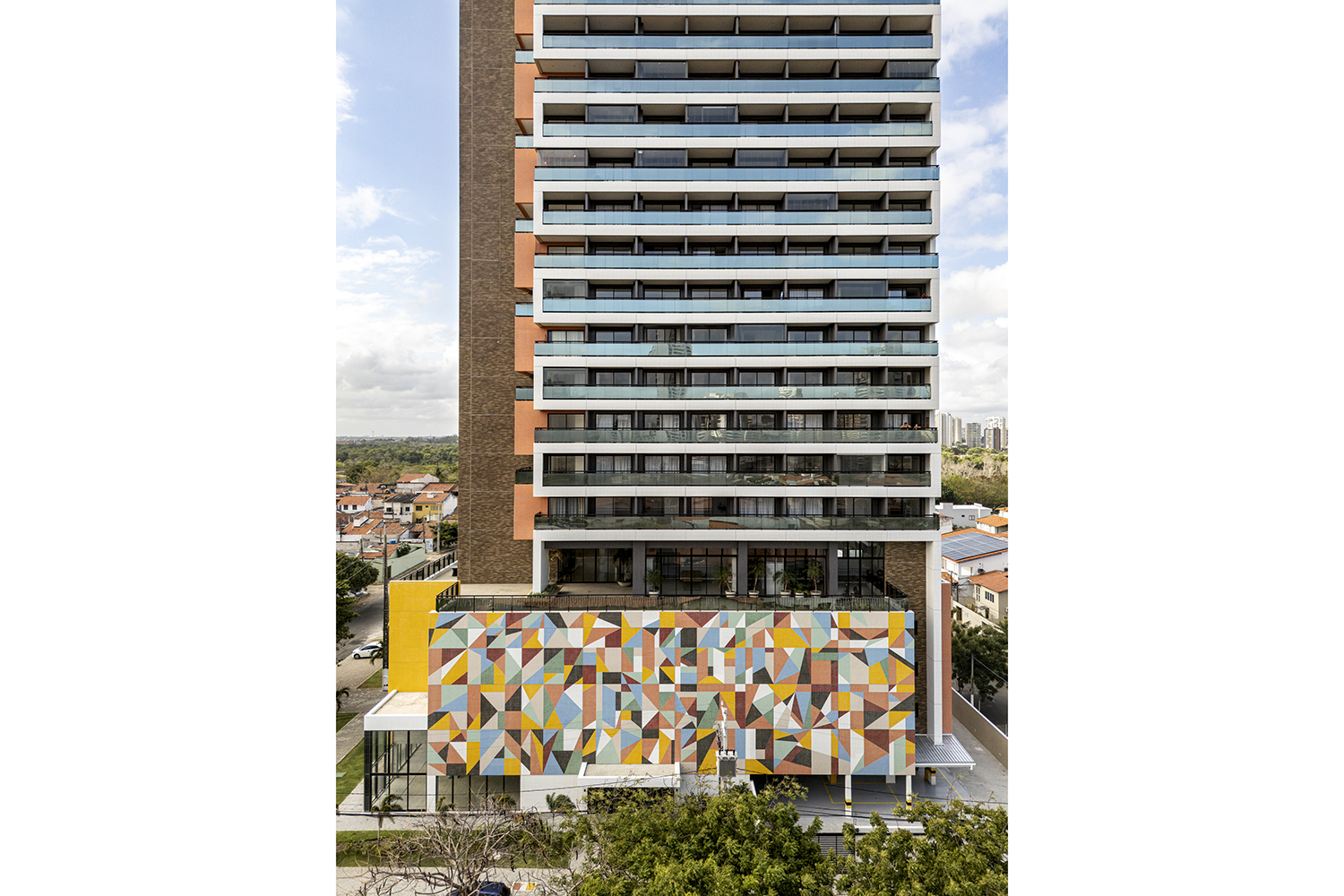 Projeto para edifício de apartamentos compactos de alto padrão. Destaca-se a fachada com cores marcantes e o grande painel artístico multicolorido.
